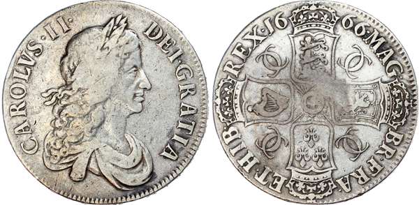 Charles II (1660-1685), Crown, 1666, second bust right, toothed border both sides, legend surrounding, CAROLVS II DEI GRATIA. Rev, crowned cruciform shields, interlinked pairs of Cs in angles, garter star at centre, date either side of top crown, six strings to Irish harp, reads MAG BR FRA ET HIB REX. Edge inscribed in raised letters, DECVS ET TVTAMEN ANNO REGNI XVIII (S.3355; Bull.366; ESC.32). Bold