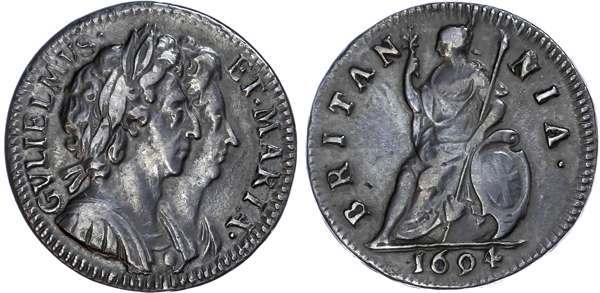 William and Mary (1688-1694), Farthing, 1694, conjoined busts right, legend surrounds GVLIELMVS ET MARIA. Rev, Britannia left with spear, shield and holding olive branch, BRITANNIA surrounds, date in exergue (S.3453; BMC.616). Dark tone with a good coverage of the outer toothed borders, portraits comprehensive and reverse with some good detail. Good very fine for issue, scarce.