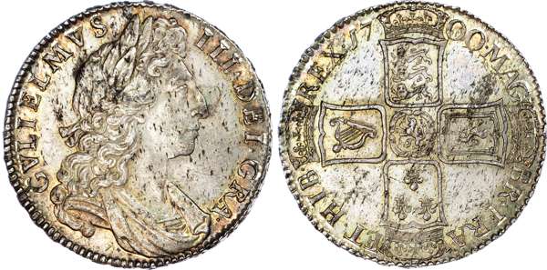William III (1694-1702), Halfcrown, 1700 DVOCECIMO, London, laureate, draped and cuirassed bust right, rev. modifi ed large crowned cruciform shields, five strings to harp, downwards lettered edge, (ESC 561; Bull 1043; S.3494). Good extremely fine, attractively toned with some light flecking.