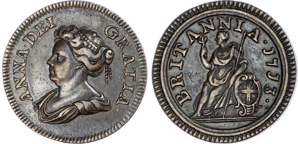 Anne (1702-1714), Pattern Farthing, 1713, in copper, draped bust left, no linear circle, reverse Britannia seated left, thin raised linear circle, edge plain, (Cooke 473; BMC 732). Near extremely fine, toned.