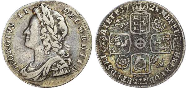 George II (1727-1760) Sixpence, 1728, young laureate and draped bust facing left, toothed border both sides. Rev, crowned cruciform shields, garter Star at centre, roses and plumes in angles, date either side of crown, milled edge (S.3707; Bull. 1740; ESC. 1606). Toned, about or near very fine.