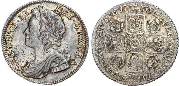 George II (1727-60), Sixpence, 1739, O over R in GEORGIVS, young laureate and draped bust left, legend surrounding GEORGIVS. II DEI. GRATIA, Rev, crowned cruciform emblematic shields, roses in angles, reads M.B.F.ET.H.REX.F.D.B. ET.L.D.S.R.I.A.T.ET.E garter star at centre, date above (S.3708; Bull.1750; ESC.1612A). The variety rare, light toning with much of the original mint bloom visible. Very fine.