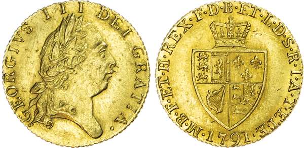 George III (1760-1820), 'Spade' Half-Guinea, 1791, fifth laureate head right, reverse Spade Shield, 4.18g, (EGC 834; S.3735) (EGC 847; S.3736). Near extremely fine with underlying mint brilliance.