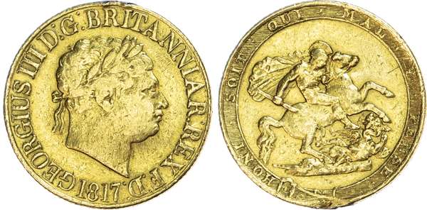 George III (1760-1820), Sovereign, 1817, first laureate head right, date below, legend surrounds from the lower left. Reverse, Saint George slaying the dragon right, (S.3785; EGC 895; Marsh 1). Fine, ex mount, solder marks visible at 12 o’clock.