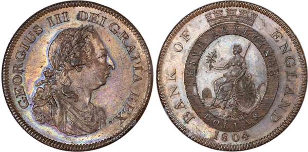 George III (1760-1820), Bank of England, Pattern Dollar, 1804, in copper, laureate, draped and cuirassed bust right, reverse Britannia seated with crowned, oval band, (ESC 152; Bull 1934). Almost as struck, some original colour with an attractive light blue toning.
