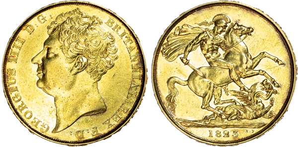 George IV (1820-1830), Two Pounds, 1823, laureate head left, reverse St. George and Dragon, edge lettered DECUS ET TUTAMEN. ANNO REGNO IV, 16.00g, (EGC 945; S.3798). Near extremely, some minor marks.