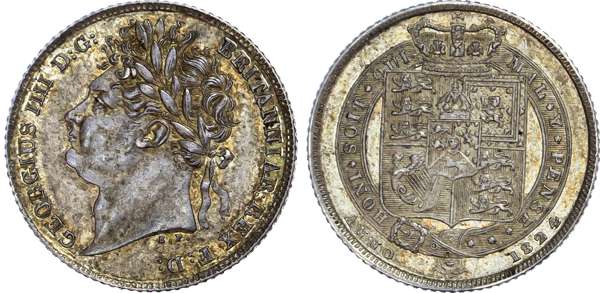 George IV (1820-30), Sixpence, 1824, first laureate bust left, B.P. for Benedetto Pistrucci below neck, legend surrounding GEORGIUS IIII DG BRITANNIAR REX FD. Rev, second crowned squared top shield of arms in garter, central escutcheon of the Arms of Hanover, French garter with motto, 1824 below (S.3814; Bull.2425; ESC.1657). Toned, free from any contact markings, good extremely fine.