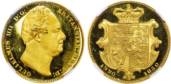William IV (1830-37), Proof Sovereign, 1830, Second bust right, nose points to second I in BRITANNIAR, rounded ear, reverse, crowned quartered shield of arms within frame, (S.3829; W&R 260, Marsh 15D R6 (only 3 or 4 specimens known to exist)). Conservatively graded by NGC as PF63+ Ultra Cameo.