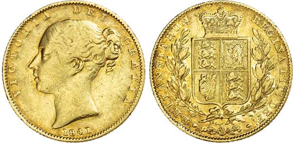 Victoria (1837-1901), Sovereign, 1841, unbarred A's in GRATIA, fi rst young head left, raised W.W. on truncation, reverse crowned 'normal' shield in wreath, edge milled, (Marsh 24A; S.3852). Obverse fine, the reverse near very fine. Light reddish tone.