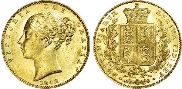 Victoria (1837-1901), Sovereign, 1842, Closed 2, first young head left, raised W.W. on truncation, reverse crowned 'normal' shield in wreath, edge milled, (Marsh 24 ‘R3’; Bentley 42; S.3852). Extremely fine, with underlying mint brilliance.