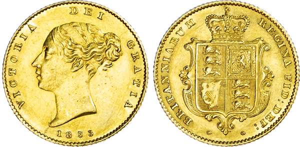 Victoria (1837-1901), Half-Sovereign, 1853, London, first small young head left, reverse crowned garnished shield, edge milled, (Marsh 427; S.3859). Extremely fine, some hairlines in obverse field.