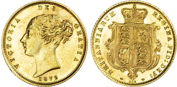 Victoria (1837-1901), Half-Sovereign, 1872, Die 346, London, young head left, coarse border beading, reverse crowned and garnished shield, die number below, edge milled, (Marsh 478; S.3860). Good very fine or better.