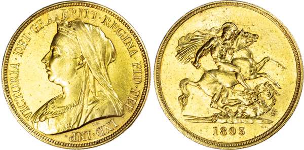 Victoria (1837-1901), Five-Pounds, 1893, crowned and veiled head left, reverse St George and Dragon, (S.3872). Good very fine, bag marks.