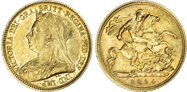 Victoria (1837-1901), Half Sovereign, 1894, veiled bust left, reverse St. George and the Dragon (S.3878). Good very fine.