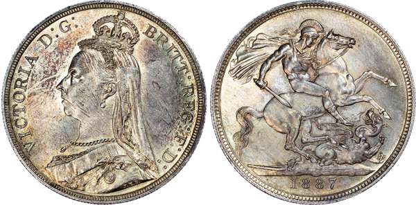 Victoria (1837-1901), Crown, 1887, Jubilee veiled and draped bust left, J.E.B on truncation for Joseph Edgar Boehm, toothed border both sides legend surrounds VICTORIA DG BRITT REG FD. Rev, Saint George on horseback slaying the dragon, date in exergue and B.P to the right for Benedett o Pistrucci, edge milled (S.3921; Bull.2585; ESC. 296). Struck with polished dies, prooflike mirrored fields and surfaces and frosted tone. Extremely fine.