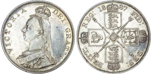 Victoria (1837-1901), Double Florin, 1887, Jubilee issue, Tower mint. Crowned and veiled bust left, J.E.B on truncation for Joseph Edgar Boehm, legend surrounds VICTORIA DEI GRATIA. Rev, crowned cruciform shields, garter star and centre ornamental sceptres in quarters, Arabic 1 in date, reads FID DEF BRITT REG, date fl anking top crown (S.3923; Bull.2697; ESC.395). Some surface marks otherwise extremely fine.