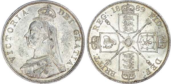 Victoria (1837-1901), Double Florin, 1889, Jubilee issue, Tower mint. Crowned and veiled bust left, J.E.B on truncation for Joseph Edgar Boehm, legend surrounds VICTORIA DEI GRATIA. Rev, crowned cruciform shields, garter star and centre ornamental sceptres in quarters, Arabic 1 in date, reads FID DEF BRITT REG, date fl anking top crown (S.3923; Bull.2701; ESC.398). Few contact marks, otherwise lustrous. Extremely fine.