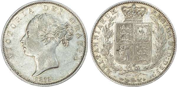 Victoria (1837-1901), Halfcrown, 1878, type A5, young head left with two plain fillets in hair, omitting W.W. on truncation, date below, legend surrounds VICTORIA DEI GRATIA. Rev, crowned quartered shield of arms within wreath, emblems below, reads BRITANNIARUM REGINA FID DEF (S.3889; ESC.701; Bull. 2751). Very fine.