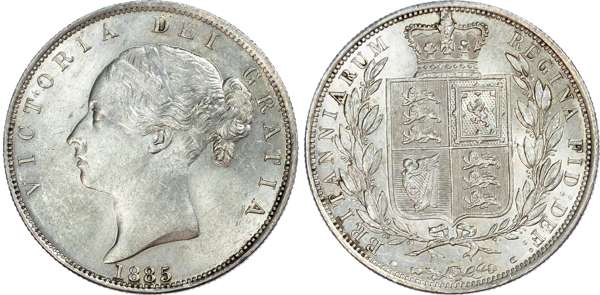 Victoria (1837-1901), Halfcrown, 1885, type A5, young head left with two plain fillets in hair, omitting W.W. on truncation, date below, legend surrounds VICTORIA DEI GRATIA. Rev, crowned quartered shield of arms within wreath, emblems below, reads BRITANNIARUM REGINA FID DEF (S.3889; ESC.713; Bull. 2765). Few bagmarks, lustrous even tone with much eye appeal. A soft initial strike, about uncirculated.