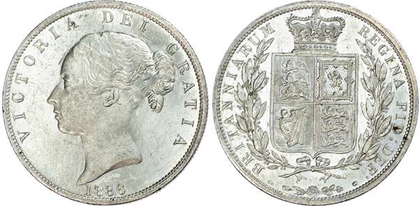 Victoria (1837-1901), Halfcrown, 1886, type A5, young head left with two plain fillets in hair, omitting W.W. on truncation, date below, legend surrounds VICTORIA DEI GRATIA. Rev, crowned quartered shield of arms within wreath, emblems below, reads BRITANNIARUM REGINA FID DEF (S.3889; ESC.715; Bull. 2767). Few nicks, otherwise mint state.
