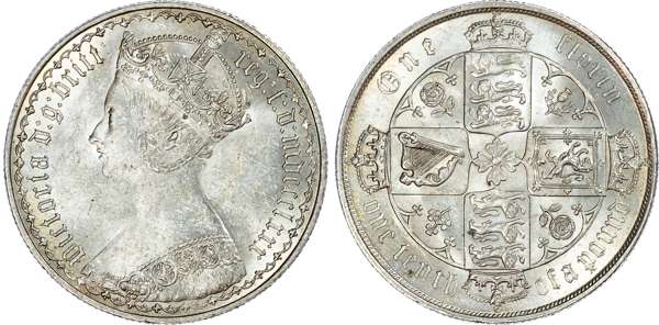 Victoria (1837-1901), Gothic Florin, 1880, Type B8, crowned bust left, without WW below bust for engraver William Wyon, legend surrounds VICTORIA DG BRIT REG FD MDCCCLXXX, within a border of arcs. Rev, four crowned shields cruciform, emblems in angles, value above, lower legend ONE TENTH OF A POUND, (S.3900; Bull.2900; ESC.854). Original mint bloom with lustrous fields, minimal soft points. About uncirculated , scarce.