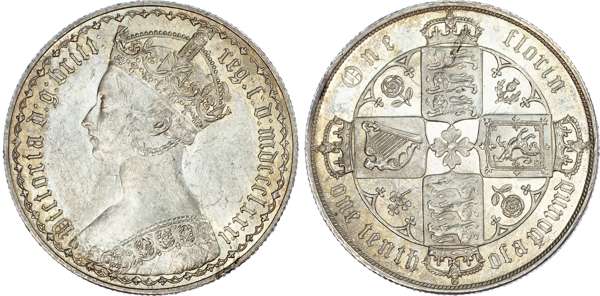 Victoria (1837-1901), Gothic Florin, 1881, Type B8, crowned bust left, without WW below bust for engraver William Wyon, legend surrounds VICTORIA DG BRIT REG FD MDCCCLXXXI, within a border of arcs. Rev, four crowned shields cruciform, emblems in angles, value above, lower legend ONE TENTH OF A POUND, (S.3900; Bull.2902; ESC.856). Toned with mint brilliance, scratch in front of bust. Despite some weakness in the die or perhaps a soft initial strike, extremely fine.