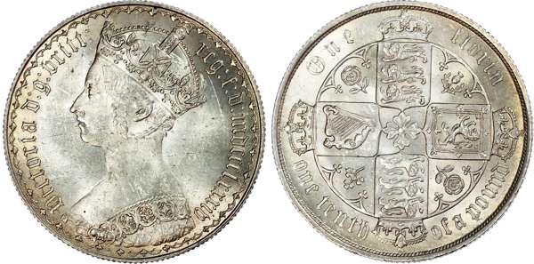 Victoria (1837-1901), Gothic Florin, 1884, Type B8, crowned bust left, without WW below bust for engraver William Wyon, legend surrounds VICTORIA DG BRIT REG FD MDCCCLXXXIV, within a border of arcs. Rev, four crowned shields cruciform, emblems in angles, value above, lower legend ONE TENTH OF A POUND, (S.3900; Bull.2907; ESC.860). Original mint bloom permeating both sides, some contact marks, otherwise extremely fine.