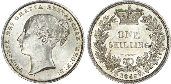 Victoria (1837-1901), Shilling, 1849, second young head facing left, omitting W.W, legend surrounds VICTORIA DEI GRATIA BRITANNIAR REG FD. Rev, crowned value within wreath, date below (S.3904; Bull.2995; ESC.1295). Olive tone, much as struck with a superb portrait, scarce.