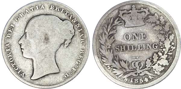 Victoria (1837-1901), Shilling, 1854, second young head facing left, omitting W.W, legend surrounds VICTORIA DEI GRATIA BRITANNIAR REG FD. Rev, crowned value within wreath, date below (S.3904; Bull.3004; ESC.1302). About fair, the date lucid, very rare. The key date within the series.