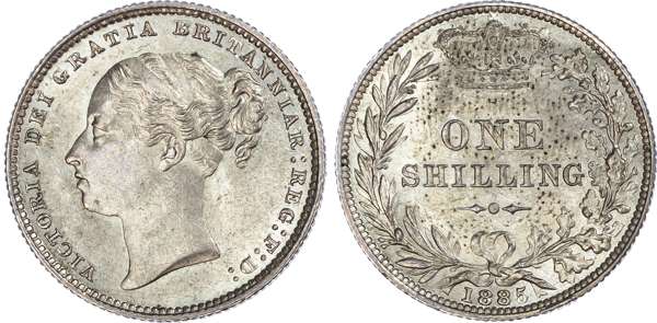 Victoria (1837-1901), Shilling, 1885, fourth young head facing left, omitt ing W.W, legend surrounds VICTORIA DEI GRATIA BRITANNIAR REG FD. Rev, crowned value within wreath, date below (S.3907; Bull.3076; ESC.1345) Toned with bloom and lustre, reverse with some carbon spots, fields clear both sides, portrait excellent. Uncirculated.