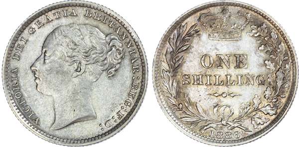 Victoria (1837-1901), Shilling, 1886, fourth young head facing left, omitt ing W.W, legend surrounds VICTORIA DEI GRATIA BRITANNIAR REG FD. Rev, crowned value within wreath, date below (S.3907; Bull.3078; ESC.1347). Toned, some surface markings, near or about extremely fine.