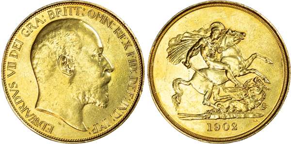 Edward VII (1901-1910), Five Pounds, Currency, 1902, bare head right, reverse St. George slaying dragon, date below, (S.3966). Near extremely fine some minor nicks and bruises.