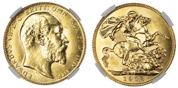 Edward VII (1901-10), Specimen, Satin Finish Sovereign, 1908 C, Ottawa, bare head right, rev. St George and dragon, c on ground line (Marsh 183 ‘R6’; S.3970). Encapsulated by NGC as SP62.