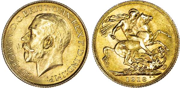 George V (1910-1936), Sovereign, 1918, Bombay Mint, India, bare head left. Rev, Saint George slaying the dragon, date below, ‘I’ on ground (S. 3998; Marsh 228). Toned, few light marks, extremely fine.