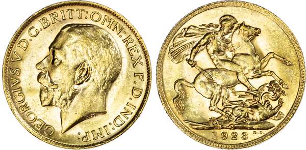 George V (1910-1936), Sovereign, 1923 P, Perth, bare head left, reverse St George and Dragon, milled edge, (Marsh 262; S.4001). Good extremely fine or better.