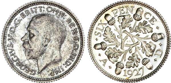 George V (1910-36), Proof Sixpence, 1927, bare head left, BM on truncation for engraver Bertram Mackennal, legend surrounding, GEORGIVS V DEI GRA BRITT OMN REX FD.IND IMP. Rev, oak wreath with outer acorns, K G [engraver Kruger Gray], date and denomination around (S.4040; Bull.3898; ESC.1816). Obverse somewhat mott led in tone, reverse crisp and without blemish. About as struck, scarce.