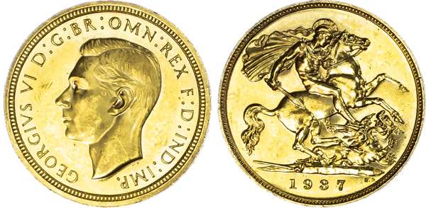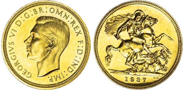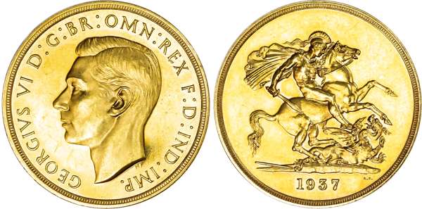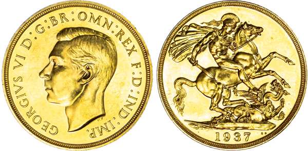 George VI (1936-1952), Coronation Gold Proof Set (4), 1937, comprising Five Pounds, Two Pounds, Sovereign, and Half-Sovereign. Bare head left, HP raised below for designer Humphrey Paget, legend and outer border surrounding, GEORGIVS VI D: G: BR: OMN: REX F: D: IND: IMP. Rev, Saint George slaying the dragon right, date in exergue, B.P. to upper right of exergue for Benedett o Pistrucci, edges plain. In original maroon case of issue, black velvet inlay (sound) (S. PS15). Lustrous, a few scratches and hairlines, otherwise good extremely fine.