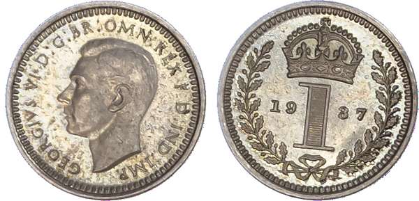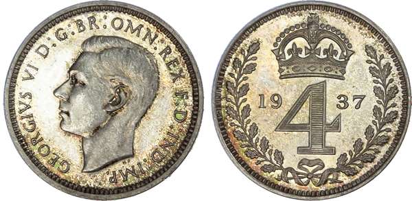 George VI (1936-52), Maundy set, 1937, bare head of King left, with raised HP for Humphrey Paget on right of truncation, legend and toothed border surrounding, GEORGIVS VI DG BR OMN REX FD IND IMP. Rev, crowned mark of value with date either side all within oak wreath (S.4086; Bull 4304; ESC.2554). Toned, brilliant as struck.