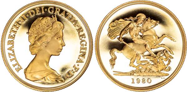 Elizabeth II (1952-2022), The Sovereign Four Coin Set, 1980, comprising a Five Pound, Two Pound, Sovereign, and Half Sovereign, crowned head right. Rev, Saint George slaying the dragon, date below (S. PGS01). In original Royal Mint box housed in capsules, as struck.