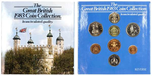 Elizabeth II (1952-2022), Uncirculated “Martini” set, 1983, consisting of One Pound to Halfpenny, including “New Pence” error reverse (S. C2A). In original presentation folder with “an invitation to join the Royal Mint Coin Club” slip. Lustrous, uncirculated.
