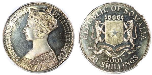 Somalia, 25 Shillings, 2001, ‘Gothic’ type bust of Victoria left. In NGC holder graded PF 66 (NGC 6768928-010).