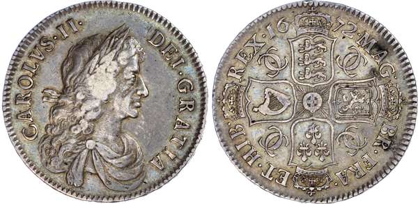 Charles II (1660-1685), Halfcrown, 1672 VICESIMO QVARTO, third laureate and draped bust variety right, reverse crowned shields cruciform, seven strings to harp, lett ered edge downwards, (Bull 460 ‘R3’; ESC 471; S.3366). Good very fine for issue, att ractively toned.