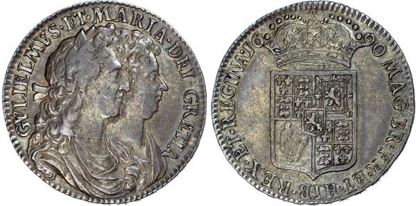 William and Mary (1689-1694), Halfcrown, 1690 SECVNDO, reads GRETIA, second V over S in GVLIELMVS, fi rst draped busts right, rev. second crowned shield, no frosting or pearls (ESC 514, Bull 848 ‘R3’; S.3434). About very fi ne, the reverse bett er. Att ractive tone.