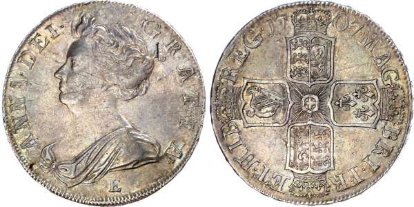 Anne (1702-1714), Edinburgh Halfcrown, 1707-E SEXTO, second draped bust left, E below, rev. crowned cruciform shields, plain in angles, seven strings to harp, lett ered edge, (ESC -; Bull 103; S.3600). Good very fi ne the reverse bett er, pleasing old tone.
