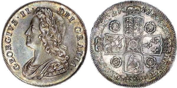 George II (1727-1760), 'Roses and Plumes' Halfcrown, 1741 over 39, DECIMO QVARTO, young laureate, draped and cuirassed bust left, reverse crowned shields cruciform, roses in angles, lett ered edge, (Bull 1682; ESC 601A; S.3693). Choice practically mint state, superbly struck, exquisite blue/olive toning. Shimmering proof like mint brilliance giving the appearance of a proof. The finest this cataloguer has seen.