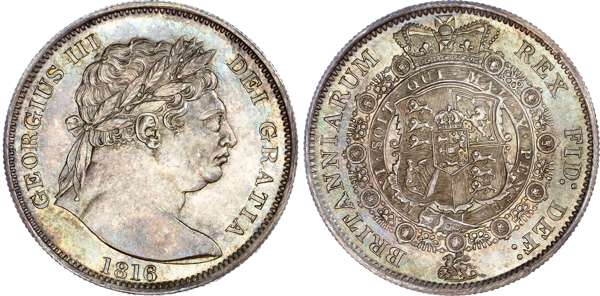 George III (1760-1820), 'Bullhead' Halfcrown, 1816, reverse crowned shield in Garter, edge milled, (ESC 613; Bull 2086; S.3788). Choice mint state and very well struck indeed. Pleasing light golden blue toning.