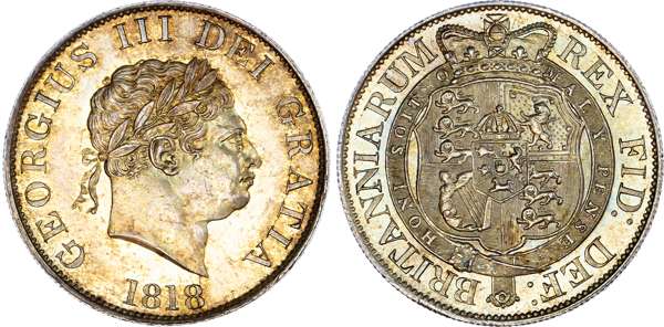 George III (1760-1820), Halfcrown, 1818, small laureate head right, reverse crowned shield in Garter, edge milled, (ESC 621; Bull 2099; S.3789). Choice virtually uncirculated, delightful olive/gold, russet toning