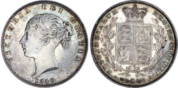 Victoria (1837-1901), Halfcrown, 1840, young head left, WW incuse, reverse crowned square-topped shield, milled edge, (ESC 673; Bull 2715; S.3887). Choice practically mint state, delightfully toned with underlying brilliance