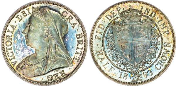 Victoria (1837-1901), Proof Halfcrown, 1893, veiled head left, reverse crowned shield in Garter, edge milled, (Bull 2779; ESC 727; S.3938). Superb as struck, exquisite blue/purple/orange toning, fi elds with a cameo proof like eff ect. Magnifi cent eye appeal. Previously encapsulated by PCGS as Proof 65 Cameo.