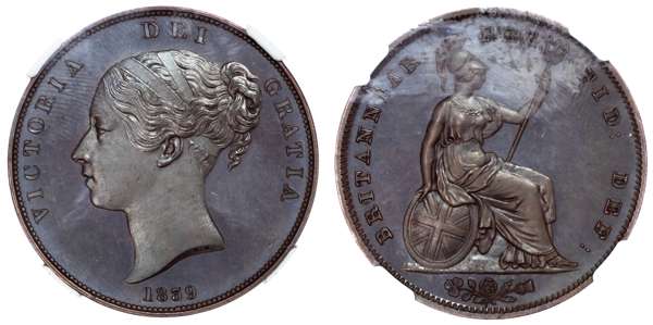 Victoria (1837-1901), Bronzed Proof Penny, 1839, young head left, reverse Britannia seated reverse, with shield and trident, (S3948; BMC 1523). Superb as struck. Encapsulated by NGC as PF64 BN.